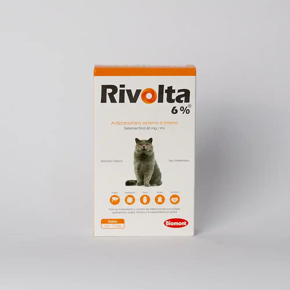 Rivolta 6% : Una pipeta de 0.75 mL para gatos de 2.6 hasta 7.5 kg de peso.